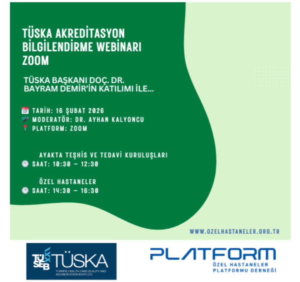 Within the scope of this legislative amendment, TÜSKA will organize an information and training webinar to inform private healthcare institutions about the accreditation process. The program, to be held with the participation of TÜSKA President Assoc. Prof. Dr. Bayram Demir and TÜSKA unit managers, will consist of two separate sessions.