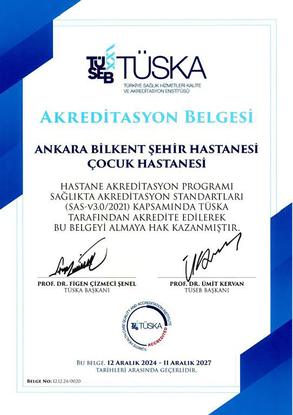 With the decision taken at the 38th Accreditation Executive Board meeting held on December 12, 2024, an accreditation certificate presentation ceremony was held for Ankara Bilkent City Hospital-Children's Hospital, which successfully completed the accreditation processes.