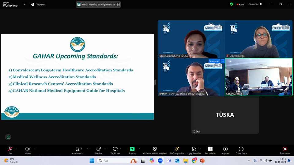 On November 12, 2024, a second meeting was held online with the participation of TÜSKA President Prof. Dr. Figen ÇİZMECİ ŞENEL, TÜSKA Head of International Programs Assoc. Prof. Dr. İbrahim Halil KAYRAL, TÜSKA department employee Didem İNCEGİL, and the Chairman of Egypt’s General Authority for Healthcare Accreditation and Regulation (GAHAR), Prof. Dr. Ahmed Abdel Hamid TAHA, along with the GAHAR working team. During the meeting, presentations were made to discuss the accreditation systems of Türkiye and Egypt, and opportunities for mutual cooperation were explored. It was agreed to hold another meeting in the future to further develop collaboration and take concrete steps in identified areas.