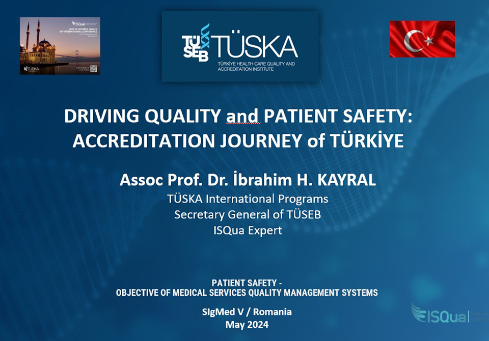 In cooperation with the Romanian Accreditation Body (CREST) and ISQua (The International Society for Quality in Health Care), the SIGMED V Conference was held in Romania on 23-24 May 2024, with the theme "Patient Safety - The Goal of Medical Services Quality Management Systems". Invited as a speaker to the conference, TÜSEB Secretary General Acting Assoc. Dr. İbrahim Halil KAYRAL made a presentation titled "Driving Quality and Patient Safety: Accreditation Journey of Türkiye" at the Patient Safety-Objective Of Medical Services Quality Management Systems session.