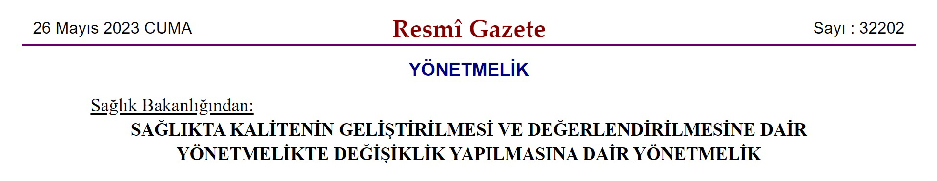 The Regulation on the Amendment of the Regulation on the Development and Evaluation of Quality in Health was published in the Official Gazette dated 26 May 2023 and numbered 32202 and entered into force.