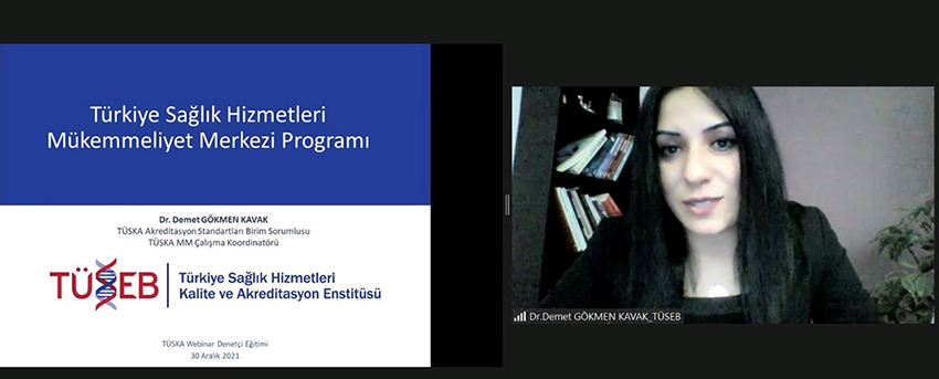 The sixth and last training of 2nd series of TÜSKA Webinar Surveyor Training Programme for accreditation surveyors in health was held on December 30th, 2021. In the last programme of the series, “Centre of Excellence System in Turkey” by Dr. Demet GÖKMEN KAVAK, the manager of TÜSKA Department of Accreditation Standards, and “Case Debate” by Dr. Gülay YAZICI, TÜSKA Department of Survey and Training Management were presented. The training programmes for accreditation surveyors will be continued by our Institute during 2022.