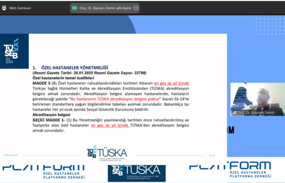 The “TÜSKA Accreditation Information Webinar,” jointly organized by the Türkiye Health Care Quality and Accreditation Institute (TÜSKA) and the Private Hospitals Platform, was successfully held on 4 September 2025.