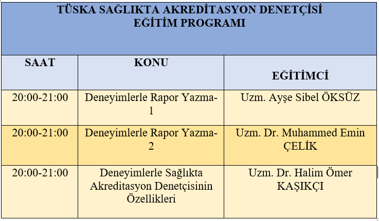 Sağlıkta akreditasyon denetçileri ve denetlenen kuruluşlardan alınan geribildirimler dikkate alınarak belirlenen eğitim ihtiyaçları doğrultusunda hazırlanan eğitimler 01 Mart 2023 – 08 Mart 2023 – 15 Mart 2023 tarihlerinde düzenlenecektir. Eğitimlere ait online katılım bilgileri ilgili eğitimin düzenleneceği hafta başında paylaşılacaktır.
