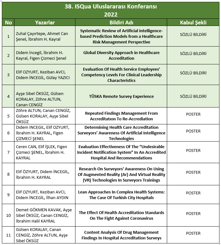 38. ISQua Uluslararası Konferansında sunulmak üzere TÜSKA tarafından gönderilen çalışmaların 4’ü sözlü 7’si poster bildiri olarak kabul edilmiştir. Kabul edilen bildirilerimiz aşağıda yer almaktadır.