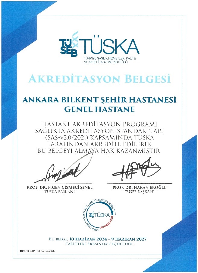 10 Haziran 2024 tarihinde yapılan 34. Akreditasyon Yürütme Kurulu Toplantısı’nda alınan kararla, akreditasyon süreçlerini başarılı bir şekilde tamamlayan Ankara Bilkent Şehir Hastanesi – Genel Hastanesi’ne akreditasyon belgesi, TÜSEB-Türkiye Sağlık Hizmetleri Kalite ve Akreditasyon Enstitüsü (TÜSKA) Başkanı Prof. Dr. Figen ÇİZMECİ ŞENEL tarafından takdim edildi.