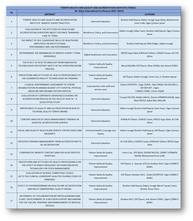 Türkiye Sağlık Hizmetleri Kalite ve Akreditasyon Enstitüsü (TÜSKA) olarak Uluslararası alandaki kalite ve akreditasyon çalışmalarını yakından takip etmek, bu alanda uluslararası tanınırlığımızı artırmak ve uluslararası iş birlikleri kurmak amacıyla her yıl ISQua konferanslarında ülkemizi temsil etmekteyiz. ISQua 2023 Konferansı 27-30 Ağustos tarihlerinde Güney Kore’nin Seul şehrinde ve ISQua 2024 Konferansı 24-27 Eylül 2024 tarihlerinde İstanbul’da gerçekleştirilecektir. 27-30 Ağustos 2023 tarihinde gerçekleştirilecek olan ISQua 2023 Seul Konferansı’nda 2024 ISQua İstanbul Konferansı Tanıtım standı kurulacaktır. Ayrıca konferansta TÜSKA tarafından hazırlanan 17 bildirinin sunumu gerçekleştirilecek olup,konferans süresince ISQua standartlarının revizyon toplantısı, İstanbul Konferansına hazırlık toplantısı, ISQua genel kurulu ve çeşitli panellerde ülkemizin temsili sağlanacaktır. 30 Ağustos 2023 tarihinde “Welcome to Türkiye 2024” oturumunda ISQua İstanbul 2024 Konferansı’na davet konuşması ve Türkiye tanıtım sunumu gerçekleştirilecektir. Konferans boyunca faaliyetlerimizi #ISQua2023, #ISQua2024, #tuska2023seoul etiketleri ile resmi sosyal medya hesaplarımızdan takip edebilirsiniz.