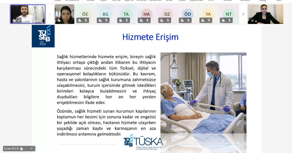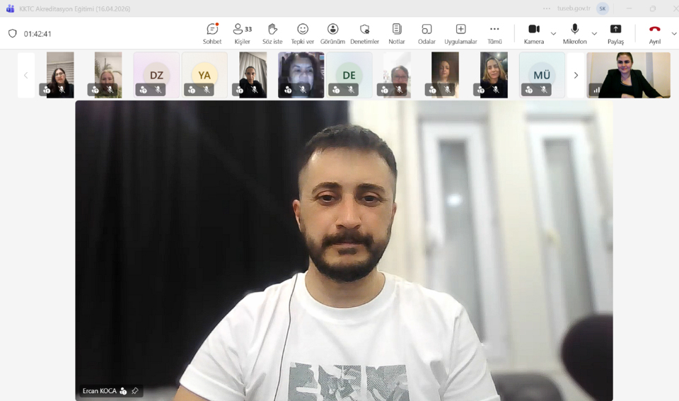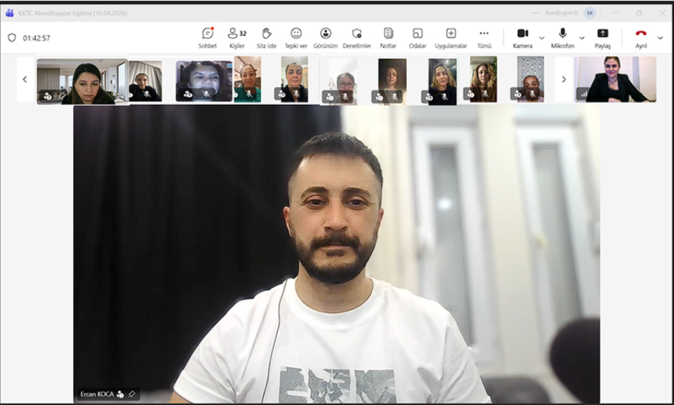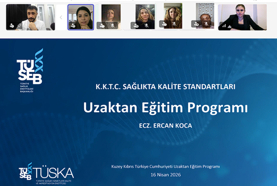 Kuzey Kıbrıs Türk Cumhuriyeti Sağlık Bakanlığına bağlı hastanelerde kalite yönetim sisteminin güçlendirilmesine yönelik yürütülen çalışmalar kapsamında, “Hizmete Erişim Standartları, Güvenlik Raporlama Standartları, Gösterge Yönetimi Standartları, Bilgi Yönetimi Standartları ve Acil Durum Yönetimi Standartları” başlıklı çevrim içi eğitim programının yedincisi, 16 Nisan 2026 tarihinde gerçekleştirildi.