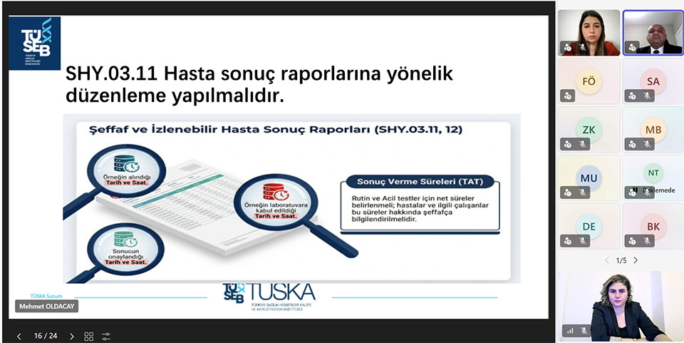 The training program was conducted by Dr. Mehmet Oldacay, MD, Member of the Türkiye Healthcare Quality and Accreditation Institute (TÜSKA) Objection and Complaints Evaluation Committee. During the program, the practices that should be implemented in healthcare facilities within the framework of laboratory service standards were discussed. The contributions of these standards to patient safety, the establishment of a healthy laboratory working environment for staff, and the improvement of service quality across all processes related to laboratory services in healthcare facilities were also comprehensively evaluated.